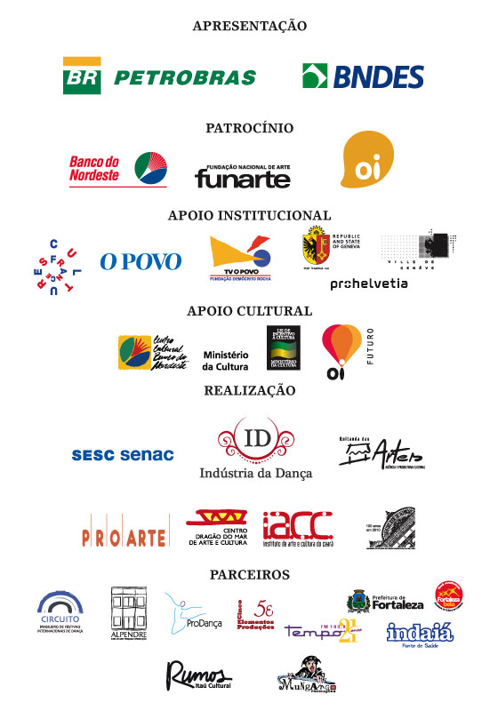 A BIENAL INTERNACIONAL DE DANÇA DO CEARÁ/DE PAR EM PAR É APRESENTADA PELA PETROBRAS E BNDES. E CONTA COM O PATROCÍNIO DO BANCO DO NORDESTE, DA FUNARTE E DA OI. APOIO INSTITUCIONAL: CULTURESFRANCE, PROHELVETIA, VILLE DE GENEVE E REPÚBLICA E ESTADO DE GENEVE. APOIO CULTURAL: MINISTÉRIO DA CULTURA, OI FUTURO, CENTRO CULTURAL BANCO DO NORDESTE E GOVERNO DO ESTADO DO CEARÁ, ATRAVÉS DA SECRETARIA DA CULTURA DO ESTADO. REALIZAÇÃO: INDÚSTRIA DA DANÇA, QUITANDA DAS ARTES, THEATRO JOSÉ DE ALENCAR, CENTRO DRAGÃO DO MAR DE ARTE E CULTURA, INSTITUTO DE ARTE E CULTURA DO CEARÁ, SESC SENAC E PROARTE. A BIENAL TEM AINDA A PARCERIA DO CIRCUITO BRASILEIRO DE FESTIVAIS INTERNACIONAIS DE DANÇA, DA PRODANÇA, DA MUNGANGO PRODUÇÕES, RUMOS ITAÚ CULTURAL, CINCO ELEMENTOS PRODUÇÕES, PREFEITURA DE FORTALEZA, ALPENDRE – CASA DE ARTE, PESQUISA E PRODUÇÃO, INDAIÁ E CAFÉ TEATRO DAS MARIAS.